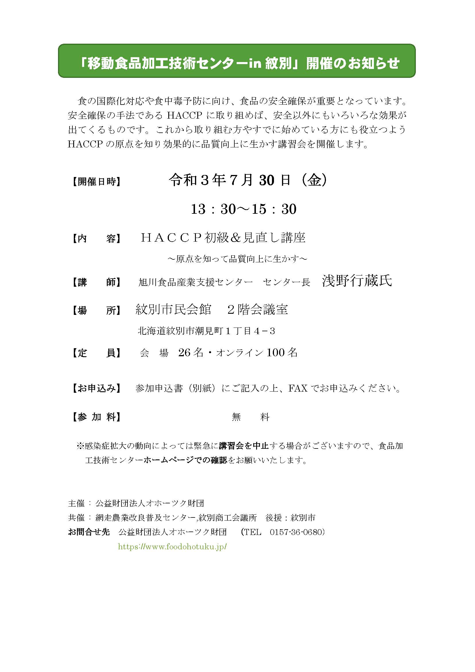 「移動食品加工技術センターin 紋別」開催のお知らせ