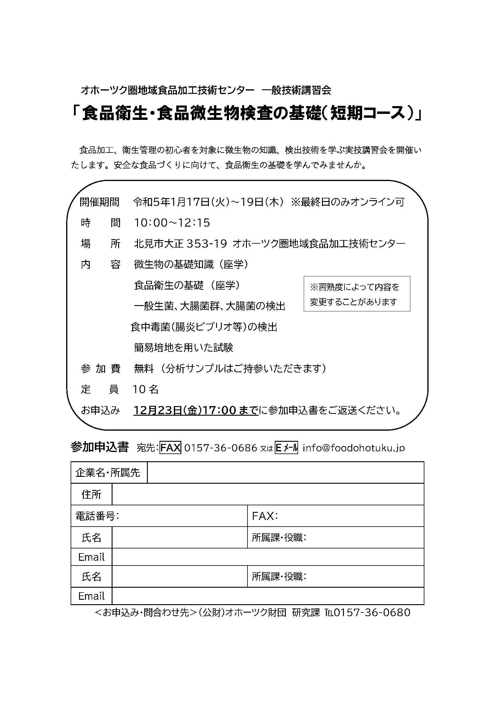 お知らせ 「食品衛生・食品微生物検査の基礎(短期コース)」開催のお知らせ 2022.11.15 この度、食品衛生・食品微生物検査の基礎(短期コース)を開催いたします。 詳細は、下記をご確認ください。皆様のご参加をお待ちしております。 【申込書】はこちら << 前へ> お知らせトップへ次へ >>
