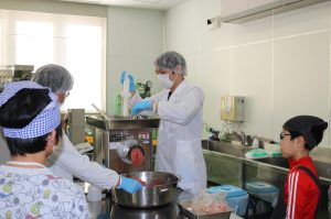 食品加工技術センターでは、地域の皆様にセンターを知ってもらうため、毎年オープンラボを開催しています。今年度は、小学校4~6年生とその保護者を対象に、冷凍ハンバーグづくり体験を実施し、当日は親子合わせて8名が参加しました。チョッパーを使用して肉をミンチに加工する工程を見学した後、参加者はハンバーグの具材を一生懸命こねて成形し、スチームコンベクションオーブンで加熱調理を行いました。さらに、急速凍結装置を用いて作ったハンバーグを凍結し、緩慢凍結との違いや品質への影響について学びました。また、食品の品質管理などに用いられるpHやBrix(糖度)について、専用の機器を使って身近な食品を測定する実験にも挑戦し、食品加工や試験・分析への理解を深める機会となりました。