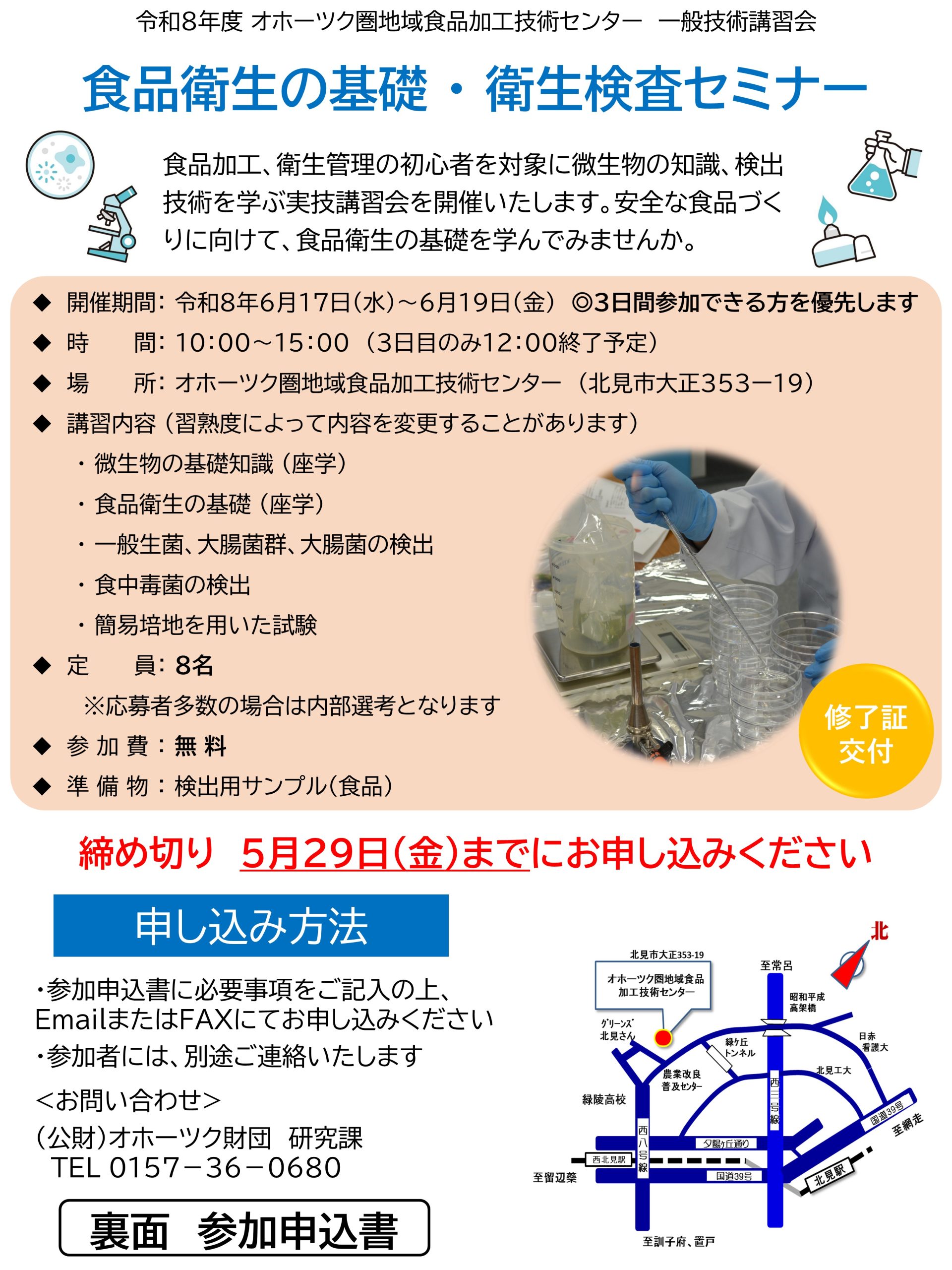 お知らせ 「食品衛生の基礎・衛生検査セミナー」開催のお知らせ 2026.04.20 食品加工、衛生管理の初心者を対象に微生物の知識、検出技術を学ぶ実技講習会を開催いたします。 皆様のご参加をお待ちしております。 食品衛生の基礎・衛生検査セミナー案内チラシ 申込書【PDF】 申込書【Word】 << 前へ> お知らせトップへ
